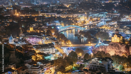 © Great Brut Here, Fototapeta premium Tbilisi, Georgia. Top View Of Famous Landmarks In Evening Or Night Illuminations. Georgian Capital Skyline Cityscape