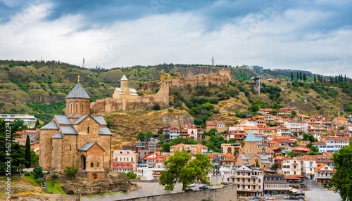 Fototapeta premium Tbilisi old town with Metekhi church, Narikala Fortress on hill and sulfur baths district. Tiflis with ancient architecture is popular tourist destination in Georgia
