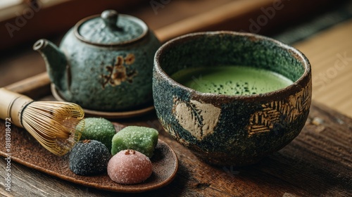 Obraz premium Tea ceremony in Kyoto ryokan matcha bowl and wagashi sweets authentic...