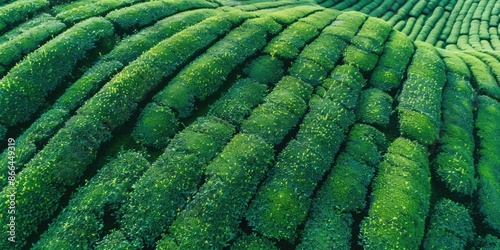 © Various Backgrounds, Fototapeta premium Tea field green plantation agriculture background top leaf farm landscape pattern drone. Organic field mountain green plant tea table view.
