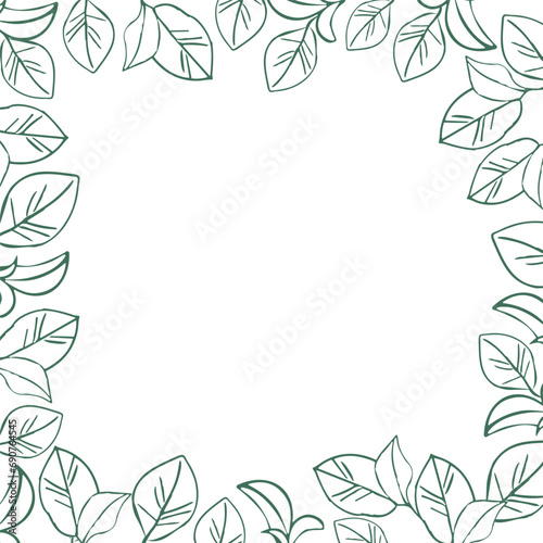 © Oksana, Fototapeta premium Tea green leaves plant banner frame, hand drawn line art vector illustration for surface design, card or wedding invite