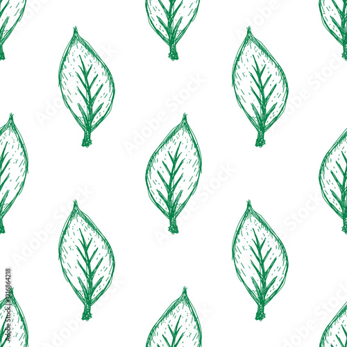 © riansa28, Obraz premium tea leaves pattern background. green leaves vector pattern background. Green tea leaf seamless pattern. seamless patterns with green leaves of tea.