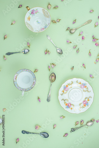Naklejka premium Tea party concept, with porcelain plates and antique silver teaspoon