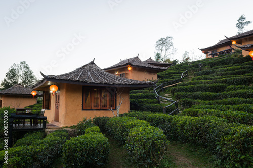 Obraz premium Tea Plantation and hut in Ban Rak Thai. Mae Hong Son, Thailand.