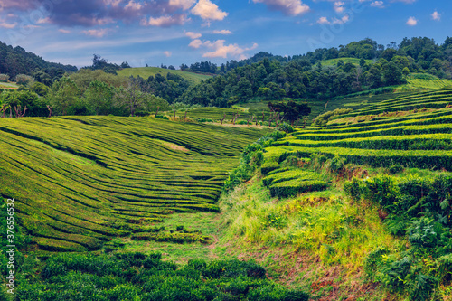 © daliu, Fototapeta premium Tea plantation in Porto Formoso. Amazing landscape of outstanding natural beauty. Azores, Portugal Europe. Tea plantation on the north coast of Sao Miguel Island in the Azores, Portugal.
