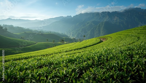 Fototapeta premium Tea plantation set against rugged mountain terrain highlighting eco-friendly...
