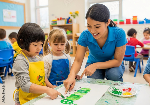© Ivul, Fototapeta premium Teacher and Children Painting Caterpillar in Classroom
