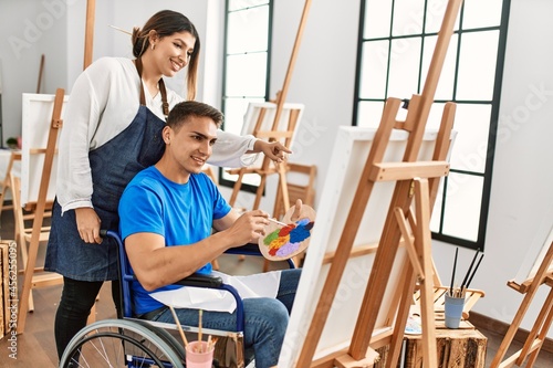 Obraz premium Teacher and disabled paint student sitting on wheelchair smiling happy...