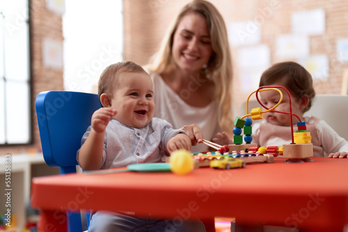 © Krakenimages.com, Fototapeta premium Teacher and preschool students playing with toys sitting on table at kindergarten