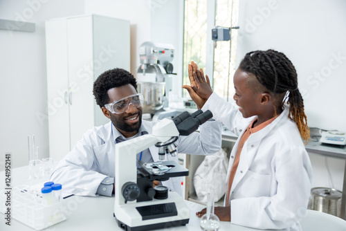 Fototapeta premium Teacher and student in lad coats looking happy and contented