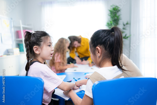 Fototapeta premium Teacher and students, Learn and study in a classroom of school where...