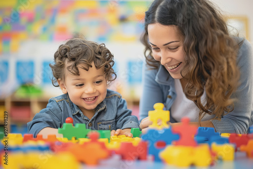 © PHAISITSAWAN, Fototapeta premium Teacher and toddler playing with maths puzzle game sitting on the table at kindergarten.