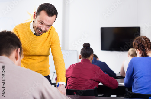 Obraz premium Teacher explaining a difficult problem to student during test in the class