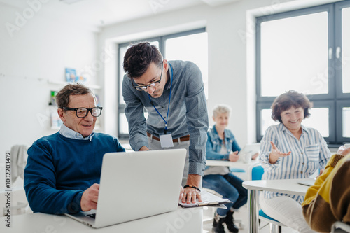 © Halfpoint, Obraz premium Teacher explaining senior students how to work with laptop and internet. Elderly people attending computer and technology education class. Digital literacy.