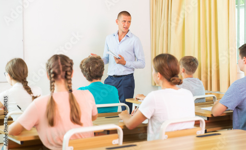 Obraz premium Teacher explaining studying material to teenagers during lesson at school,...