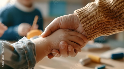 Obraz premium Teacher Gently Holding Student's Hand in Classroom Setting