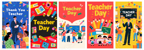 © BashoLab, Obraz premium Teacher’s Day Celebration Posters with Teachers and Students in Classroom