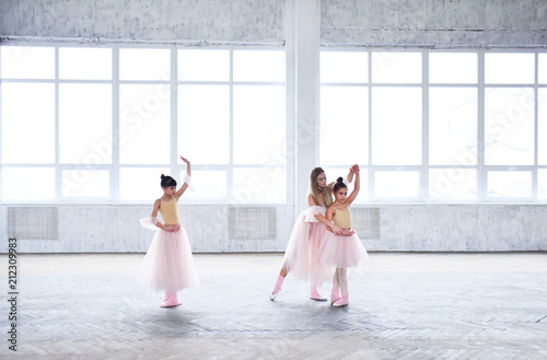 Naklejka premium Teacher trains ballet moves with little girls in pink clothes in the room