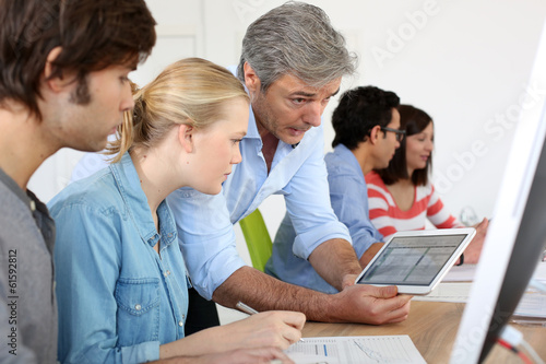 © goodluz, Obraz premium Teacher using digital tablet in school class