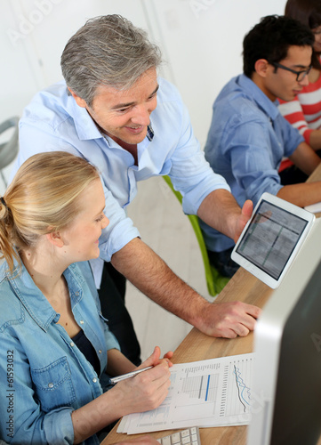 © goodluz, Obraz premium Teacher using digital tablet in school class