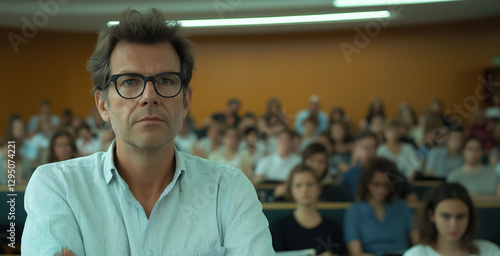 Fototapeta premium Teacher with arms crossed, in the background several blurred students sitting in an auditorium