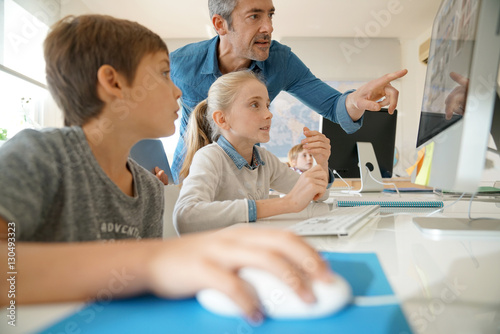 Fototapeta premium Teacher with school kids in computer laboratory