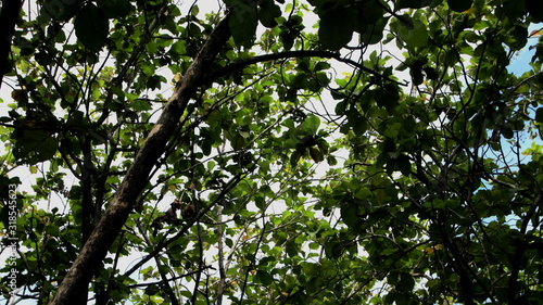 © onyengradar, Fototapeta premium Teak forest in the photo from below, with selective focus, blurry, and out of focus