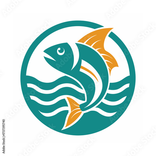 © Abdus, Naklejka premium Teal and Orange Fish Jumping in Water Circle Logo waves