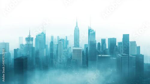 © sarayut, Naklejka premium Teal and White City Skyline in Foggy Atmosphere