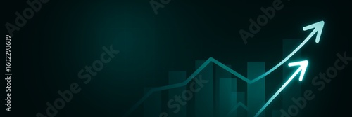 Fototapeta premium Teal arrows ascend over a dark background with glowing bar graph elements