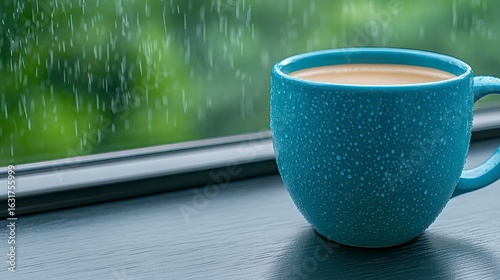 Obraz premium Teal Coffee Mug On Windowsill During Rainy Day