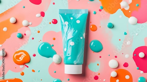 © abangaboy, Fototapeta premium Teal Cosmetic Tube on Abstract Colorful Background
