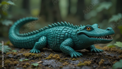© Ai DreamscapesTH, Fototapeta premium Teal Crocodile Figurine in Forest Setting A Detailed Decorative Reptile Model
