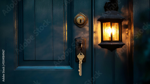 Obraz premium Teal Door with Golden Key and Illuminated Lantern at Night