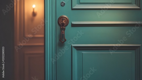 © rehan, Obraz premium Teal Door With Ornate Brass Handle And Lighting