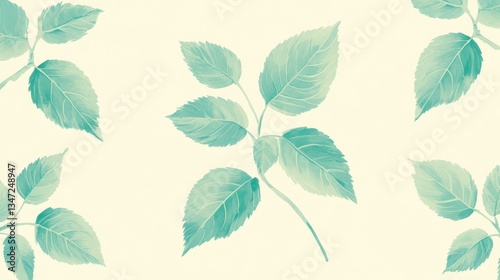 © background, Obraz premium Teal Green Leaves Pattern on Light Background.