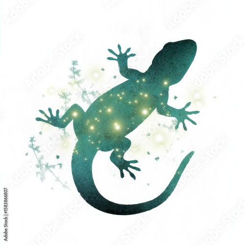 © ahmad, Naklejka premium Teal lizard silhouette with glowing spots and foliage