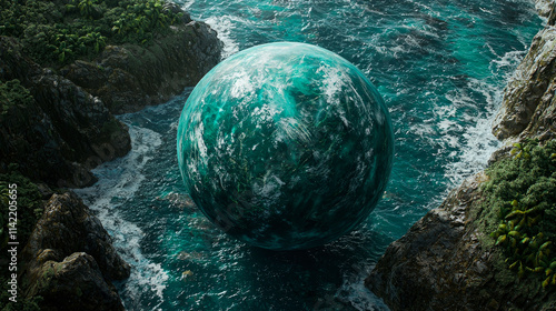 © creative, Fototapeta premium Teal sphere in ocean inlet.