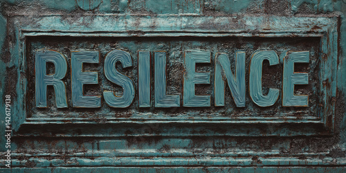 Fototapeta premium Teal textured metallic background with embossed word Resilience, conveying strength and perseverance