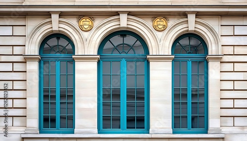 © Cintia, Fototapeta premium Teal windows, ornate stone facade