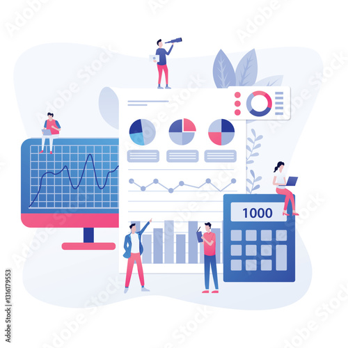 © Fianpanic, Obraz premium Team analyzing data graphs on screen, calculator; future planning