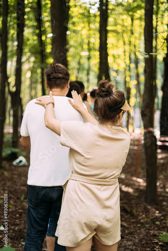 Fototapeta premium Team building exercise. People stand behind each other and hold their...
