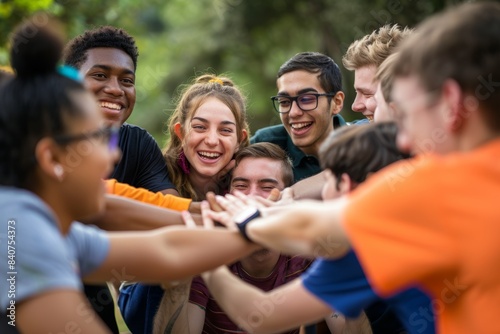 Fototapeta premium Team Building Exercise with Happy Students Enhancing Collaboration and Trust...