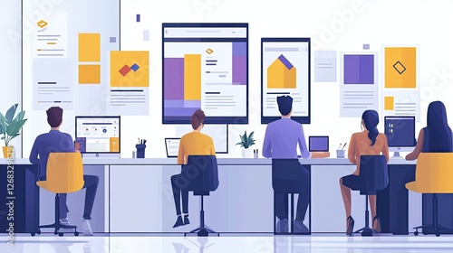 © aritha, Obraz premium Team collaborating in a modern office environment, analyzing digital designs on multiple screens