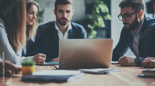 Fototapeta premium Team Collaboration Around Laptop in Modern Office
