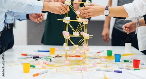Obraz premium Team collaboration building marshmallow spaghetti tower challenge