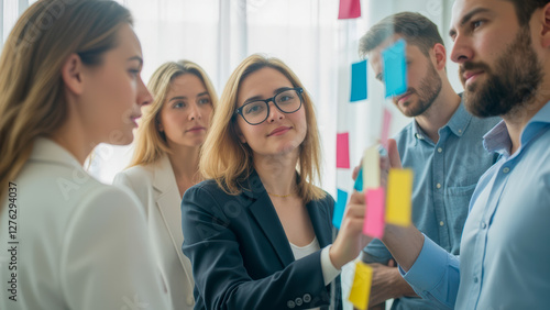 Fototapeta premium Team Collaboration in Office Setting with Young Professionals Engaging in Creative Brainstorming Session Using Sticky Notes