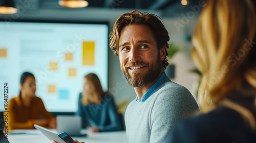 Fototapeta premium Team Collaboration Using Digital Tablets and Whiteboard in Modern Office