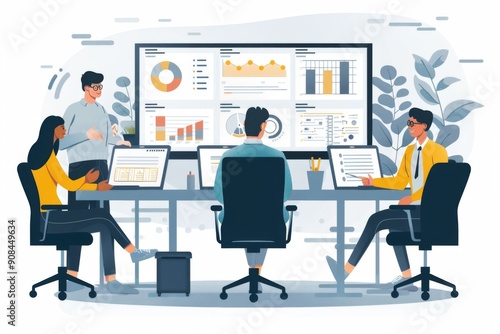 © racesy, Fototapeta premium Team Meeting with Data Analysis on a Large Screen