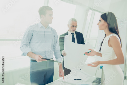 © deagreez, Obraz premium Team of architects holding blueprint and discussing new project